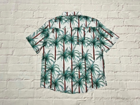 ナイロン生地にパームツリーや幾何学風な模様をプリントしたリゾート感、満載のシャツになります。同じ生地でショーツもあるので、セットアップも可能です。