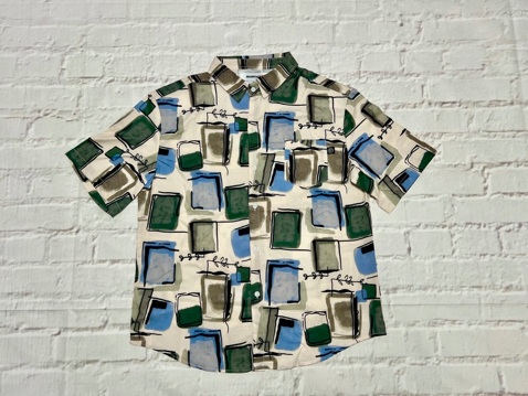 ナイロン生地にパームツリーや幾何学風な模様をプリントしたリゾート感、満載のシャツになります。同じ生地でショーツもあるので、セットアップも可能です。
