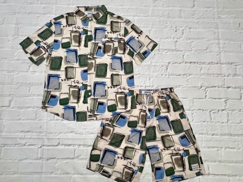 ナイロン生地にパームツリーや幾何学風な模様をプリントしたリゾート感、満載のシャツになります。同じ生地でショーツもあるので、セットアップも可能です。