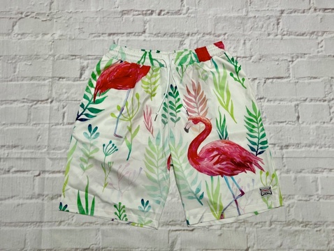 ナイロン生地にフラミンゴ柄をプリントした、ショーツになります。普段使いはもちろん、プールや海などにも使用可能な水陸両用です。